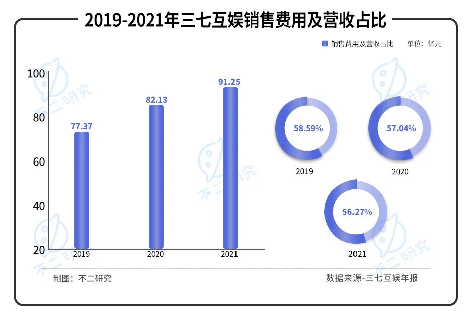 以三七互娱为例。根据年报,三七互娱2019年~2021年销售费用为77.37亿元、82.13亿元和91.25亿元,分别占当期营收的58.59%、57.04%和56.27%,复合年增长率达到47.88%。