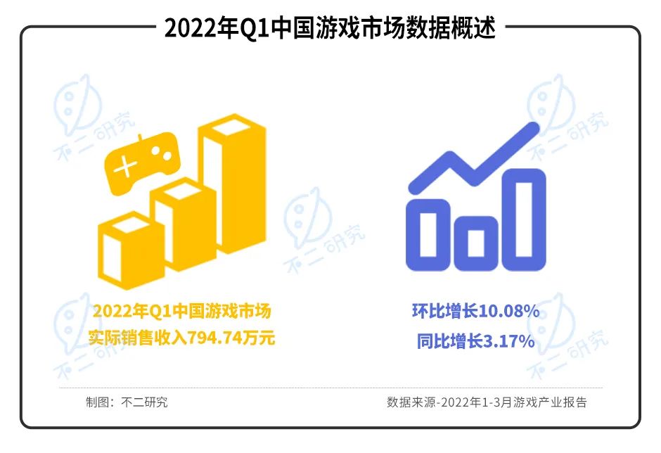 根据伽马数据《2022年1-3月游戏产业报告》,2022年一季度中国游戏市场实际销售收入794.74亿元,环比增长10.08%,同比增长3.17%,增速低于去年同期。
