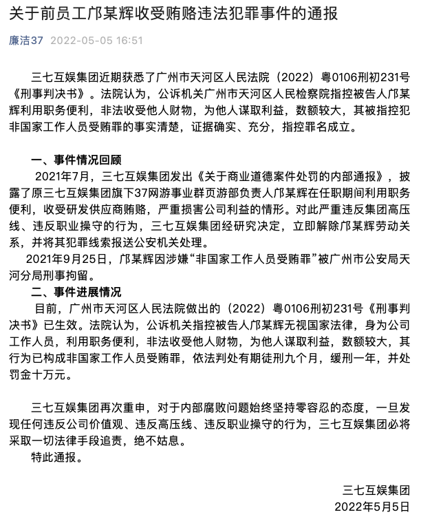 5月5日,三七互娱集团通报前员工邝某辉收受贿赂违法犯罪事件:目前,广州市天河区人民法院做出的(2022)粤0106刑初231号《刑事判决书》已生效。法院认为,公诉机关指控被告人邝某辉无视国家法律,身为公司工作人员,利用职务便利,非法收受他人财物,为他人谋取利益,数额较大,其行为已构成非国家工作人员受贿罪,依法判处有期徒刑九个月,缓刑一年,并处罚金十万元。