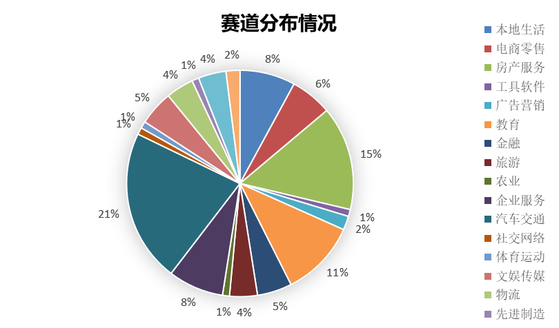 从投资分布特点来看,58同城涉及领域众多,占比前三的有汽车交通、房产服务和教育领域,合计占总投资数量的47%,而剩余的份额则分布在其他的15个领域。可见58同城投资方向极为分散。