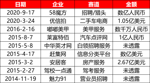 此外,58同城还在本地生活服务领域收购了美甲上门服务公司「嘟嘟美甲」,在垂直招聘服务领域,收购了营业员招聘网站「魅力 91」、白领招聘网站「中华英才网」等等。