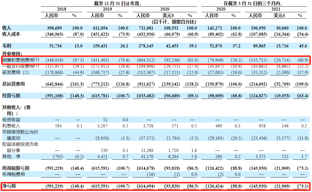 快狗打车最新招股书显示,公司在2018年~2021年的亏损净额分别10.71亿、1.84亿、6.58亿及8.73亿元,而其销售及营销费用分别为5.24亿元、2.96亿元、1.95亿元和3.35亿元,占当年总营收的115.7%、54.0%、36.7%和50.7%。