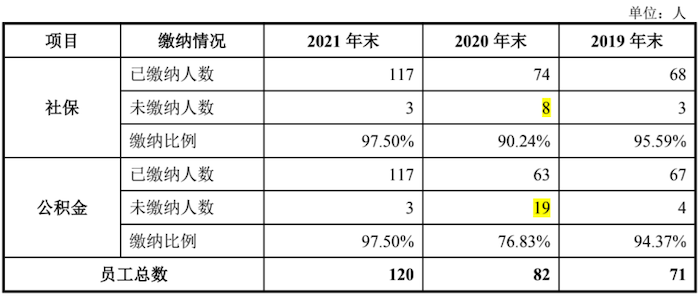 界面新闻记者注意到,2020年,晶升装备存在19名员工未缴纳公积金,该年公积金缴纳比例仅76.83%,远低于2019年94.37%和2021年97.50%的公积金缴纳比例。
