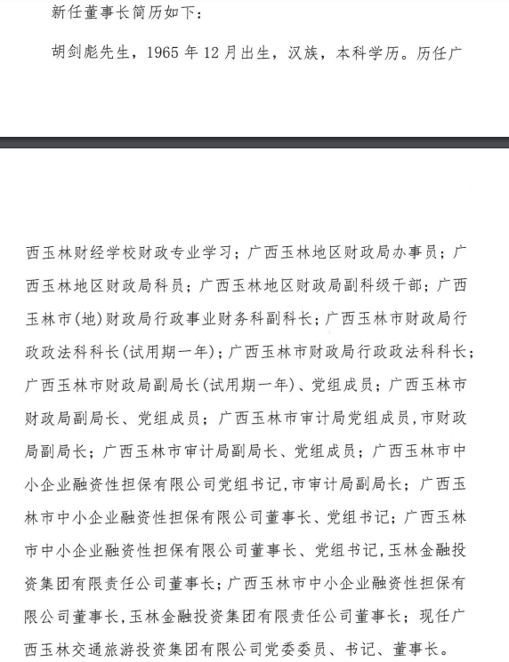 5月6日,玉林交通旅游投资集团有限公司发布公告:根据玉林市人民政府文件《玉林市人民政府关于吴文东等同志任免职的通知》,任命何刚为广西玉林城市建设集团有限公司董事长、玉林市城市建设投资集团有限公司董事长,免去其玉林交通旅游投资集团有限公司董事长职务。任胡剑彪为玉林交通旅游投资集团有限公司董事长。