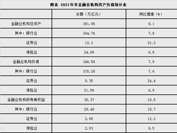 据官方披露的数据,2021年末,我国金融业机构总资产为381.95万亿元,同比增长8.1%。金融业机构总资产、负债和所有者权益是银行业、证券业和保险业机构相应指标的汇总数,不包括小贷公司。