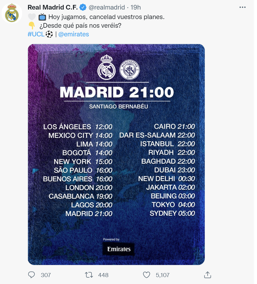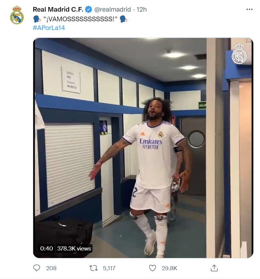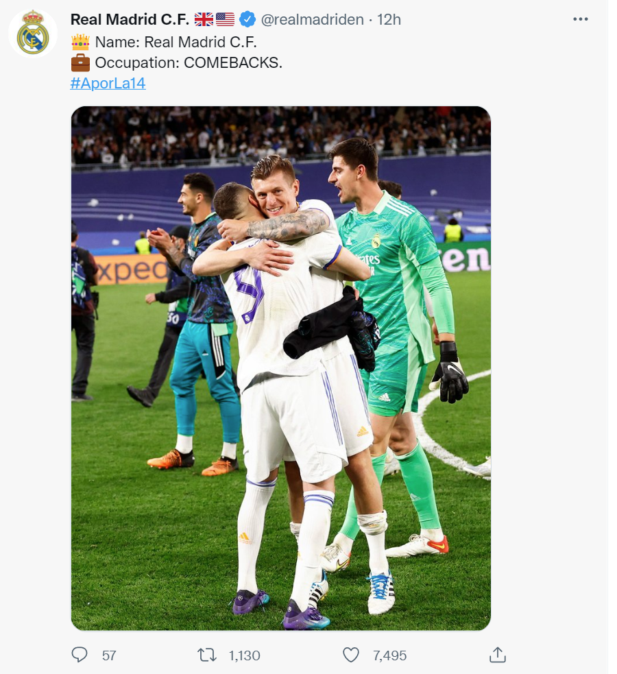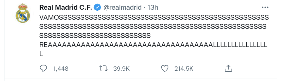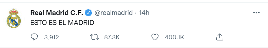 在加时赛开始之前,皇马官方推特发布的推文:ESTO ES EL MADRID(这里是马德里)成为了当天互动量最高的单条推文
