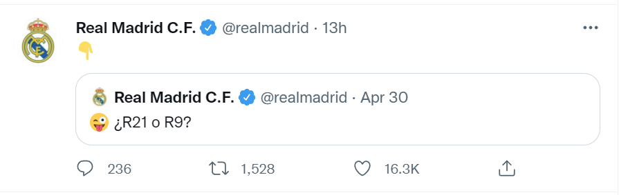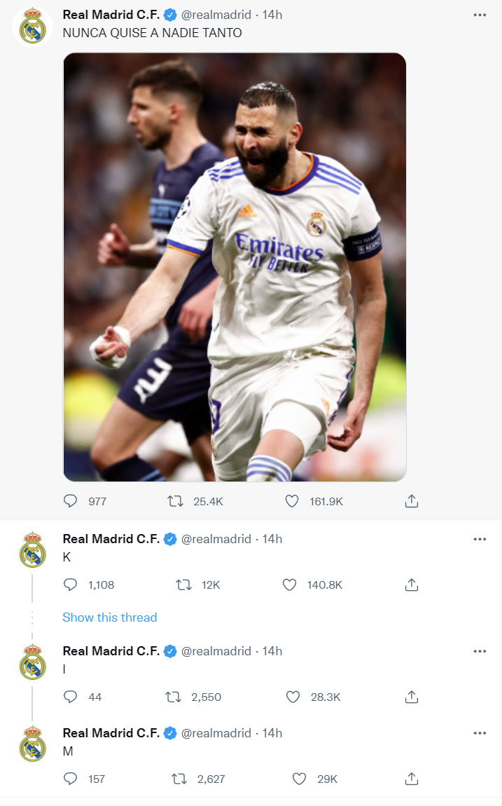特别是在本泽马打入反超的进球之后,皇马用转推的方式在评论区排列出本泽马的名字「Karim」,引发了众多球迷的效仿和互动。如果将原推文以及每个字母的互动量相加,这一条推文,也成为了当晚皇马官方推特上互动量最高的一条。