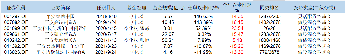 除了在ETF板块上接连受挫外,以李化松为代表的平安基金主动权益团队也乏善可陈。