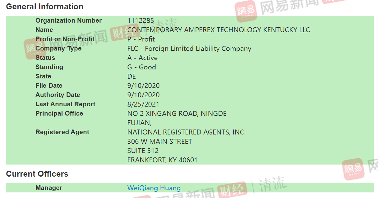 清流工作室从权威渠道查询到,肯塔基新能源公司成立于2020年9月10日——即在宁德时代作出投资承诺之后,该公司的总经理是WeiQiang Huang。此外,肯塔基新能源公司实际上最早注册于美国特拉华州。