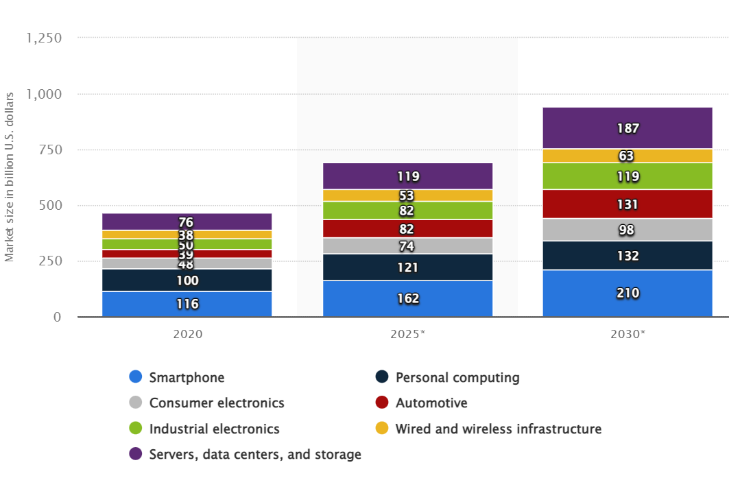 从2019年开始,前五大芯片设计巨头和Top10中后五大厂商营收开始逐渐拉开差距。这不仅是因为前五大芯片设计巨头较早地在市场上取得了优势,更是因为其所处于智能手机、数据中心、5G、PC等快速增长的市场。根据数据统计公司Statista的数据,从2020年到2030年,智能手机都是全球半导体市场中最大的细分领域,2020年智能手机半导体市场达1160亿美元,到2030年这一数字可能将变为2100亿美元。