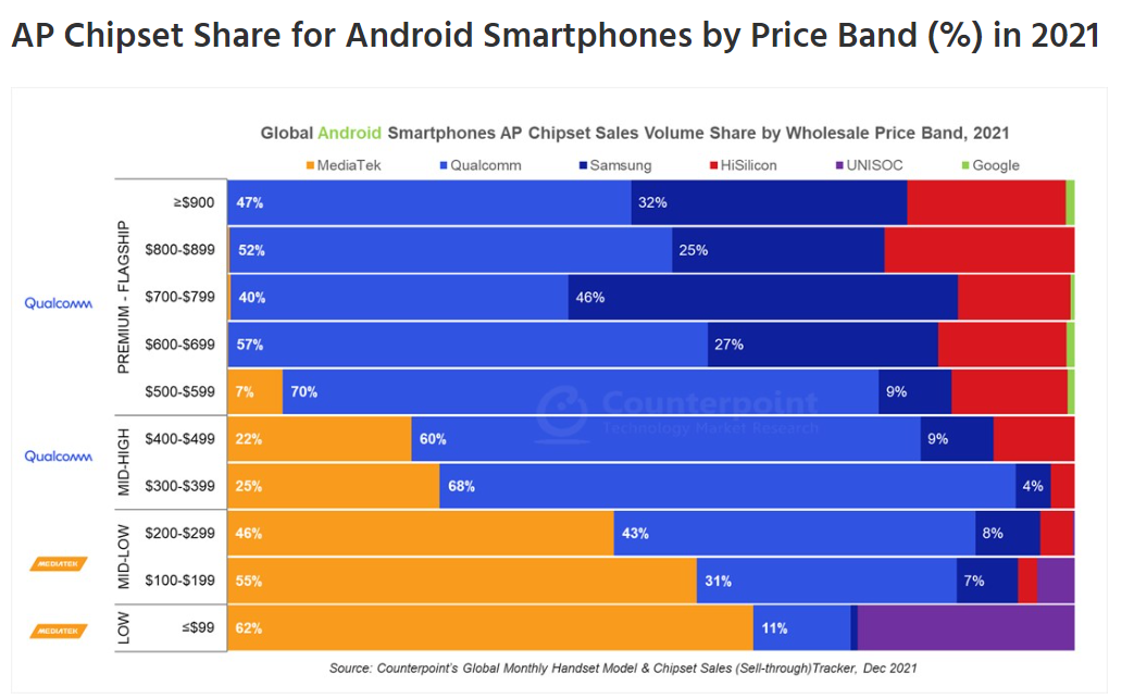 ▲2021年按价格区分的安卓手机AP/SoC芯片组份额(图片来源:Counterpoint)