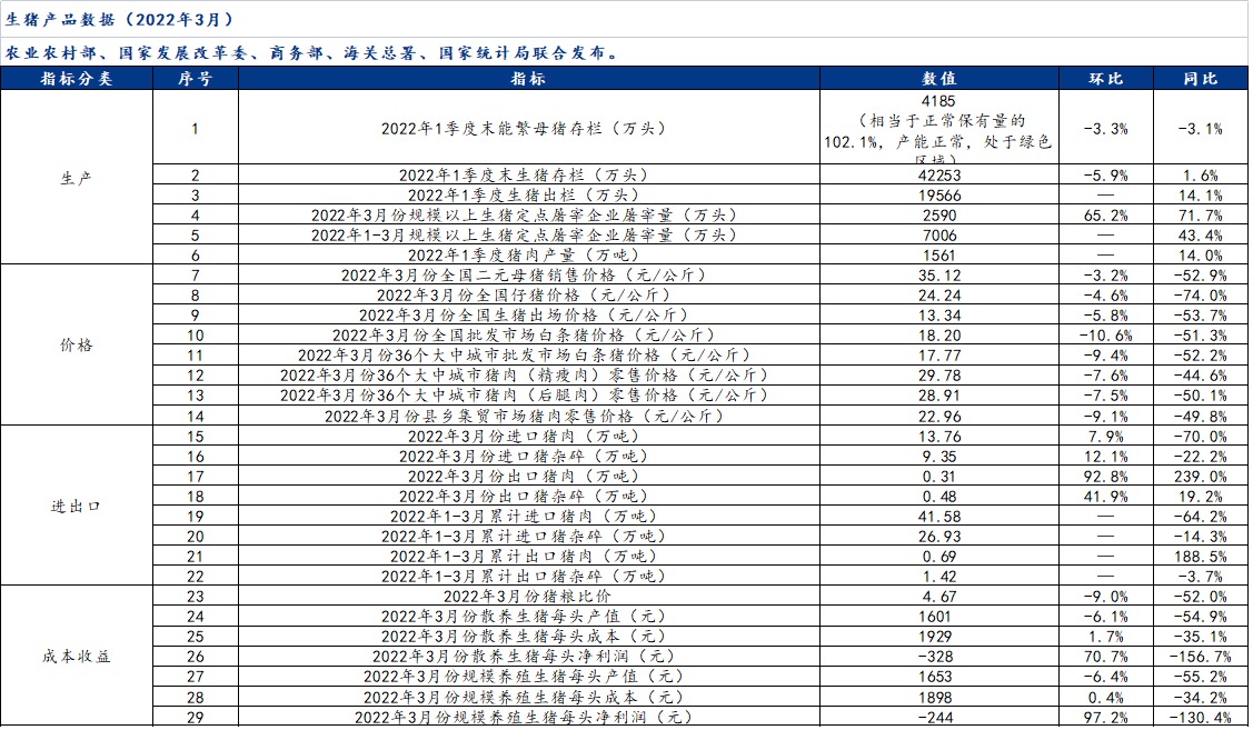 根据4月18日五部委联合发布数据显示,2022年第一季度,我国能繁殖母猪存栏为4185万头,环比下降3.3%,相当于正常保有量的102.1%,产能正常,处于绿色区域。
