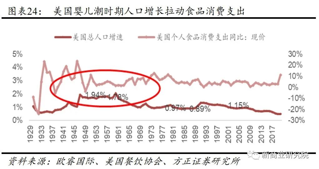 1920-2000年,婴儿潮、速冻技术、城市化共同驱动美国餐饮业量价齐升,以连锁快餐为代表的现代餐饮兴起。 1920年美国颁布禁酒法案,迫使餐厅将经营重心从高利润酒水服务转移至餐饮服务本身,中低档餐厅大量产生。 二战(1939-1945年)结束后,“婴儿潮”拉动人口快速增长,1946-1964年,美国新生儿总数达到7600万人,年轻人口的增加拉动美国居民个人食品消费支出增速高达15.17%,带来大规模的餐饮增量需求。