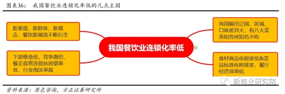 尽管需求端依旧保持景气,但相较于美日等高连锁率的成熟市场,我国餐饮供给侧目前仍相对分散,总体还处于连锁化的初级阶段。 而我国餐饮业连锁化率低的主要原因在于: 1)我国幅员辽阔,区域、口味差异大,传统中餐就有八大菜系,还有各地知名小吃; 2)受制于技术等因素,菜品标准化程度差,高度依赖厨师,而且食材等商品化程度低,劳动力密集,最终导致餐厅经济效率低,难以快速连锁复制; 3)在经济高增长、生活节奏加快背景下,消费者观念、口味日新月异,新渠道、新群体不断衍生餐饮新潮流; 4)由于下游壁垒低、内部竞争激烈,餐企直营连锁化容错率低,行业淘汰率高,据统计,餐饮门店平均生存期不过508天。