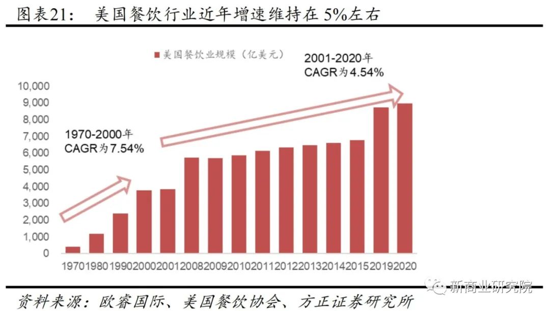 美国餐饮业历经一个多世纪的发展,行业相对成熟。据美国餐饮协会统计,行业市场规模从1970年的428亿美元增长至2020年的8990亿美元,五十年CAGR达6.28%;2020年餐饮业雇员数量将达到1313万人,约占美国就业人口的十分之一。