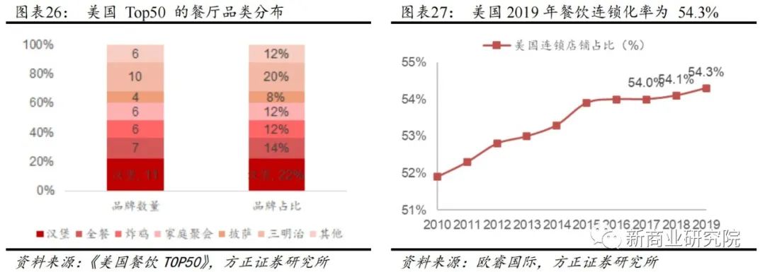 美国餐食产业历经百年发展,已进入高度成熟期下游餐企规模化特征明显,根据欧睿国际的统计数据,2019年美国餐饮业连锁化率达到54.3%。
