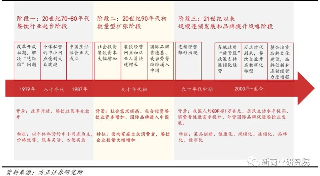 20世纪70-80年代是我国餐饮行业的起步阶段。 1979年,改革开放初期,为解决“吃饭难”问题,以个体经营为主的中小餐馆陆续出现并逐渐被少部分的消费者接受,这一时期的餐馆以价格优惠、服务灵活和方便实惠为主要特点。 随着经济发展,消费者餐饮需求逐步提升,20世纪90年代投资于餐饮的资本大幅增加,餐饮经营网点和行业从业人员激增,餐饮企业数量快速扩张。