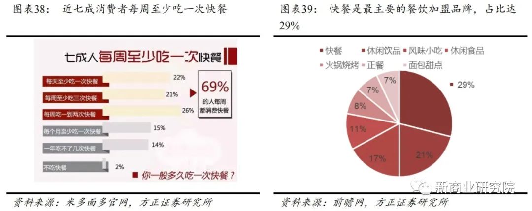 随着不断加快的社会节奏对用餐时间的压缩以及消费观念健康化、品牌化的崛起,以加盟为主的快餐业发展如火如荼,根据米多面多官网数据显示,69%的人每周至少会吃一次快餐,22%的人表示每天至少吃一顿快餐。 而消费者对就餐效率和体验要求的提高,推动单一品类、高周转率的餐厅快速崛起,如新茶饮、卤品鸭脖、酸菜鱼等,进一步推进连锁化进程。