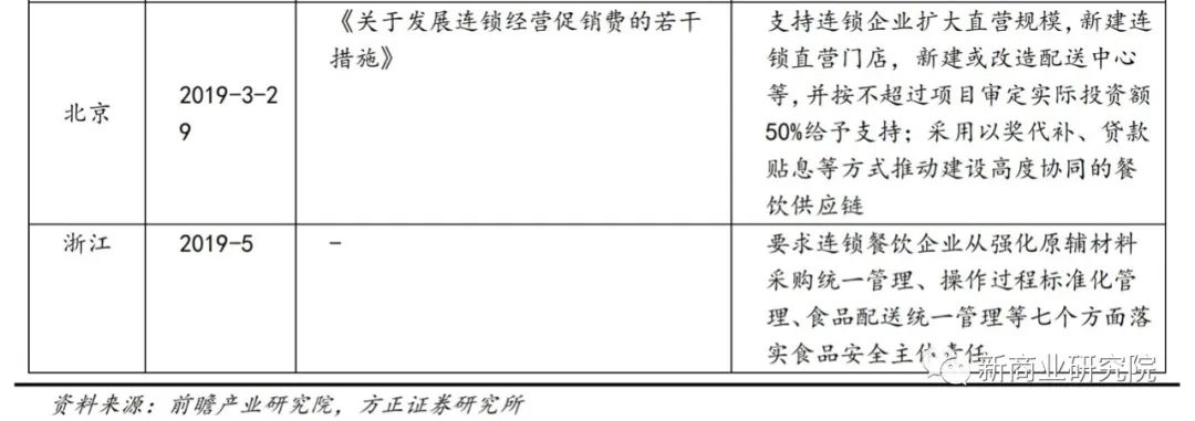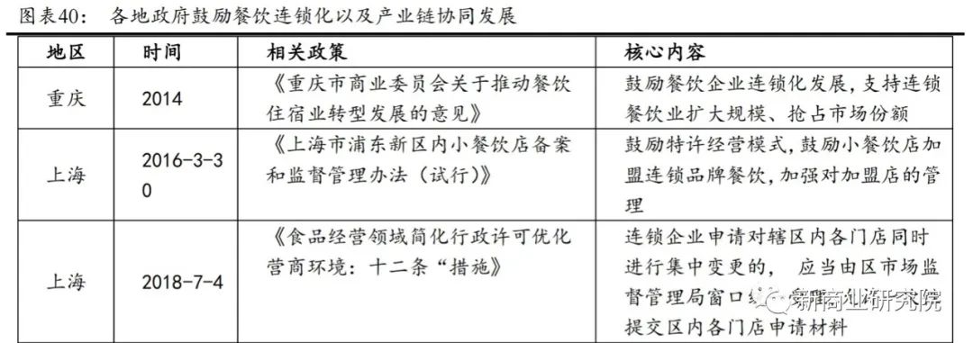在餐饮业食品安全问题频出、行业高淘汰率的背景下,为进一步保障民生、引领行业迈向新的发展阶段,各地政府“放管服”改革的持续深化,为餐饮连锁化、规模化进程提供制度/政策保障,包括公开表态支持、简化连锁餐饮行政流程、奖励补贴等资金支持以及规范供应链监管。