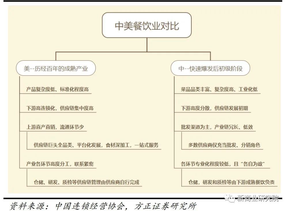 对比美国成熟的餐饮产业,我国餐饮供应链效率较低,有较大进步空间。 首先,大部分供应链公司仅发挥着批发、分销作用,充当连接上游原材料供应商和下游餐饮企业角色; 第二,大部分仓储、研发和质检部分还是由下游餐饮企业负责。从供给的角度,中餐品类的多样化、工艺的复杂化程度远超西餐,对连锁餐企标准化程度提出了更高的要求。