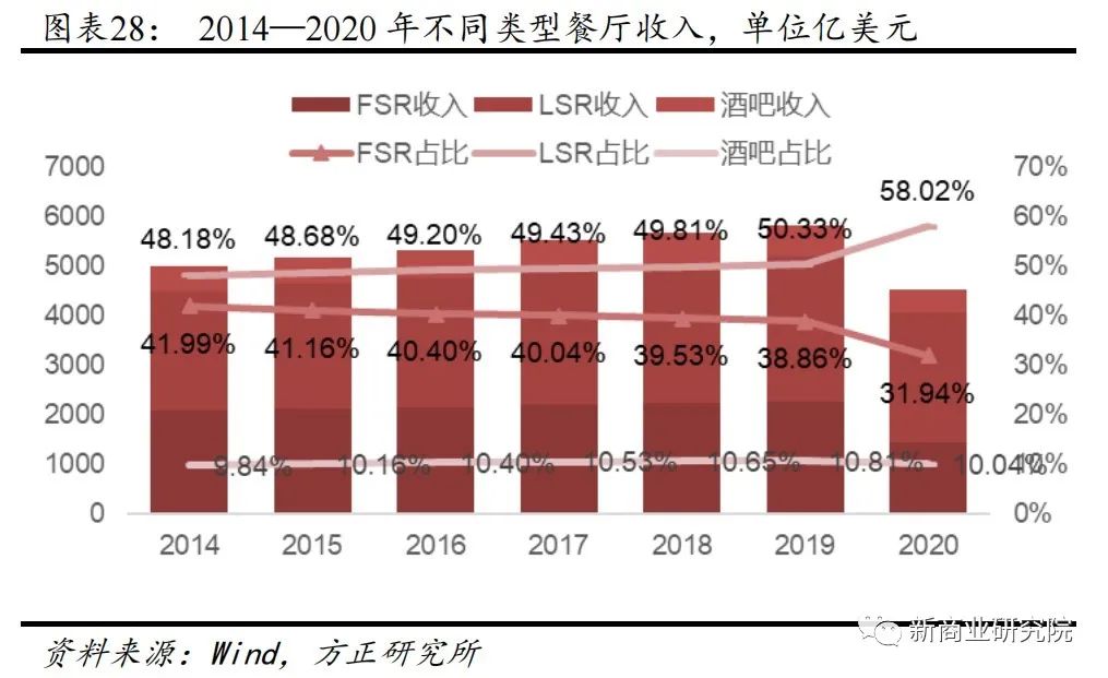 两者主体地位相对平均,2019年数量占比分别是35.20%、44.59%。从收入端来看,LSR经过十年发展收入占比反超FSR,并不断拉开差距。 2020年疫情影响下,美国LSR收入占美国餐饮企业总收入的58%,而FSR收入占比仅32%,份额差来到近年最大值16%。