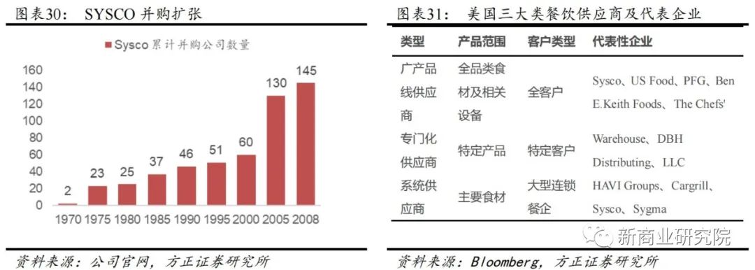 餐饮供应链搭建属于重资产经营模式,主要环节包括采购、仓储、央厨加工、物流等多个重要节点,需要投入大量资金、人力、时间,因此,餐饮供应商基本盘牢固后,纷纷通过积极并购、发挥产业协同,快速整合市场,以达到上游资源稳定、成本可控的目的。 例如,美国餐饮供应龙头Sysco在1970-2008年间共收购了145家公司,平均每年完成3.8起并购。