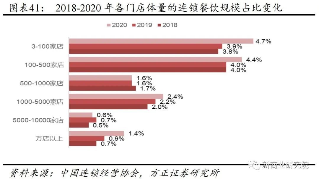 而从门店数分布来看,百家以内规模的连锁餐饮占比最高,100-500家规模的连锁门店数次之,且两者数量占比在2020年都呈现明显增长,分别从2018年的3.8%和4.0%增长至2020年的4.7%和4.4%。