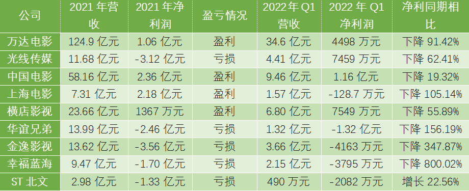 同样依靠院线业务支撑的金逸影视、幸福蓝海已经显露出了困境,2021年到今年Q1一直处在亏损状态。