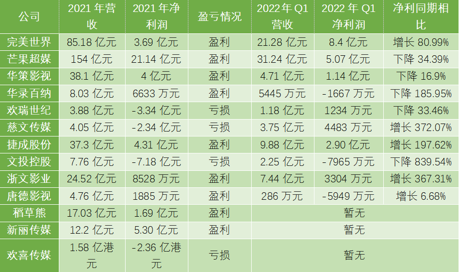 五一前,资本市场影视公司们陆续发布了2021年年度财报及2021年一季度报告。行业受疫情影响,在挣扎了两年之后,终于还是露出了疲态。据不完全统计,资本市场22家影视公司,其中2021年总体保持盈利的公司达到13家,2022年Q1季度保持盈利的公司达到11家,但同时达到这两个条件的公司只有8家。
