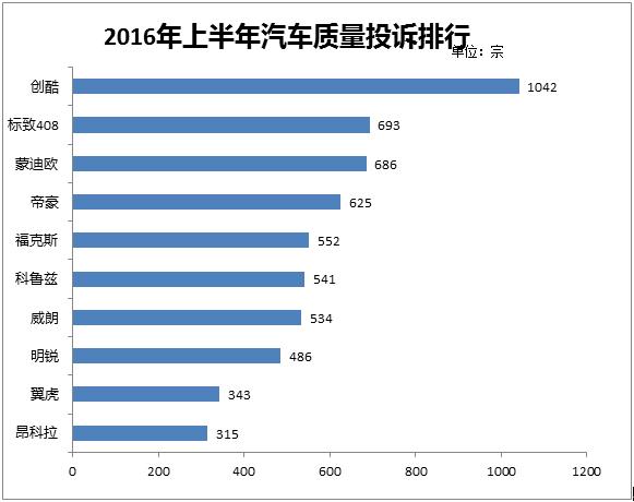 一句话点评:轮胎开裂磨损问题投诉已成为2016年上半年故障问题之首,并且绝大多数集中在上汽通用部分车型,创酷投诉数量最多,高达1042宗。