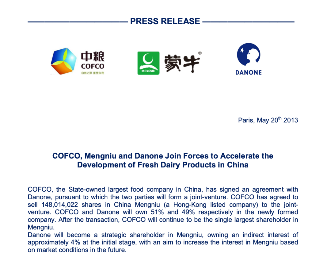 时间来到6年后,两家公司“再续前缘”。2013年7月,中粮、达能、蒙牛签署协议,达能通过与中粮的合资公司持有蒙牛乳业4%的股份,成为蒙牛的战略股东,并计划将来根据市场进展增持蒙牛的股份。