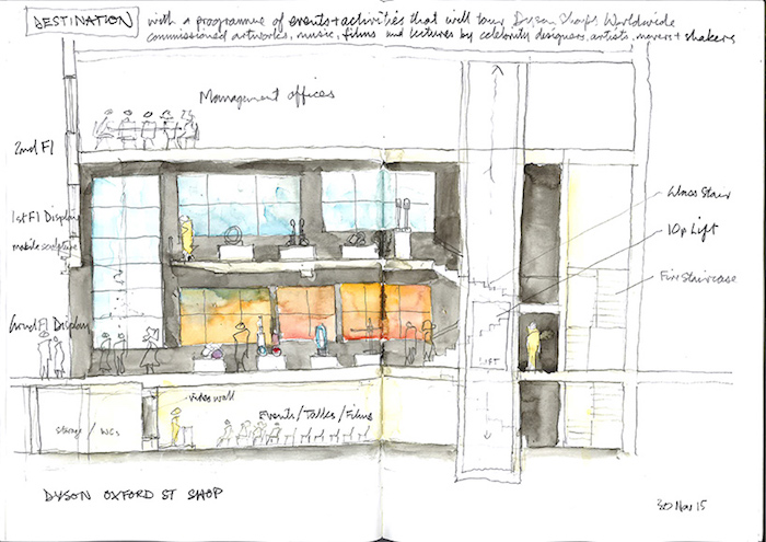 实际上,这个零售空间是戴森创始人James Dyson和建筑工作室Wilkinson Eyre展开的一项零售设计试验合作。戴森希望这个空间可以鼓励消费者近距离观察和亲身试用戴森的产品。而如果试验效果令人满意,类似的空间还将在全球范围内铺开。下面两张图片就是这个空间的设计图,从中也许你能读到设计师的一些巧思。