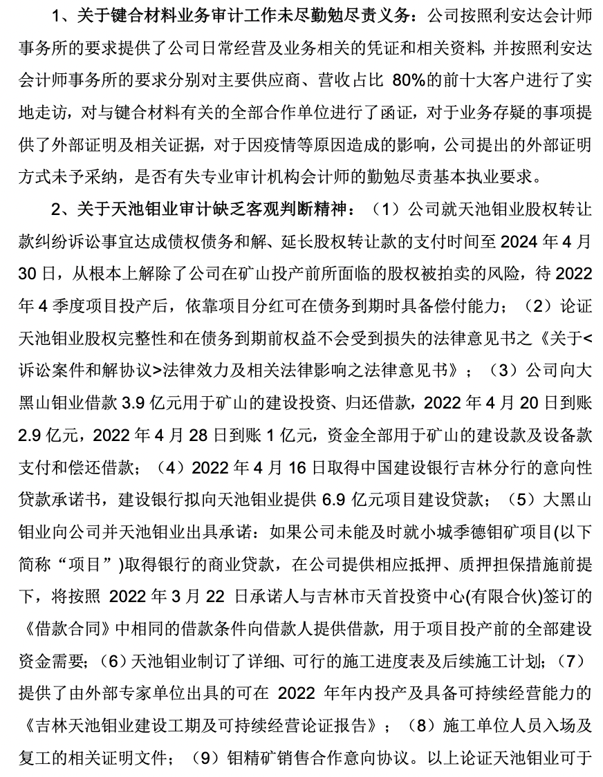 利安达也在回函中提到,鉴于事务所对公司2021年度财务报告审计工作尚在现场审计阶段,就目前已取得的证据资料和执行的审计程序,未见异常或不合规事项。