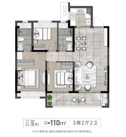 建面约110㎡三房两厅两卫,一击即中买房者们的心。入户玄关保证了私密性,方正的户型,南北通透,客餐厅一体,动线明朗,双阳台设计,增强房间整体通透性;