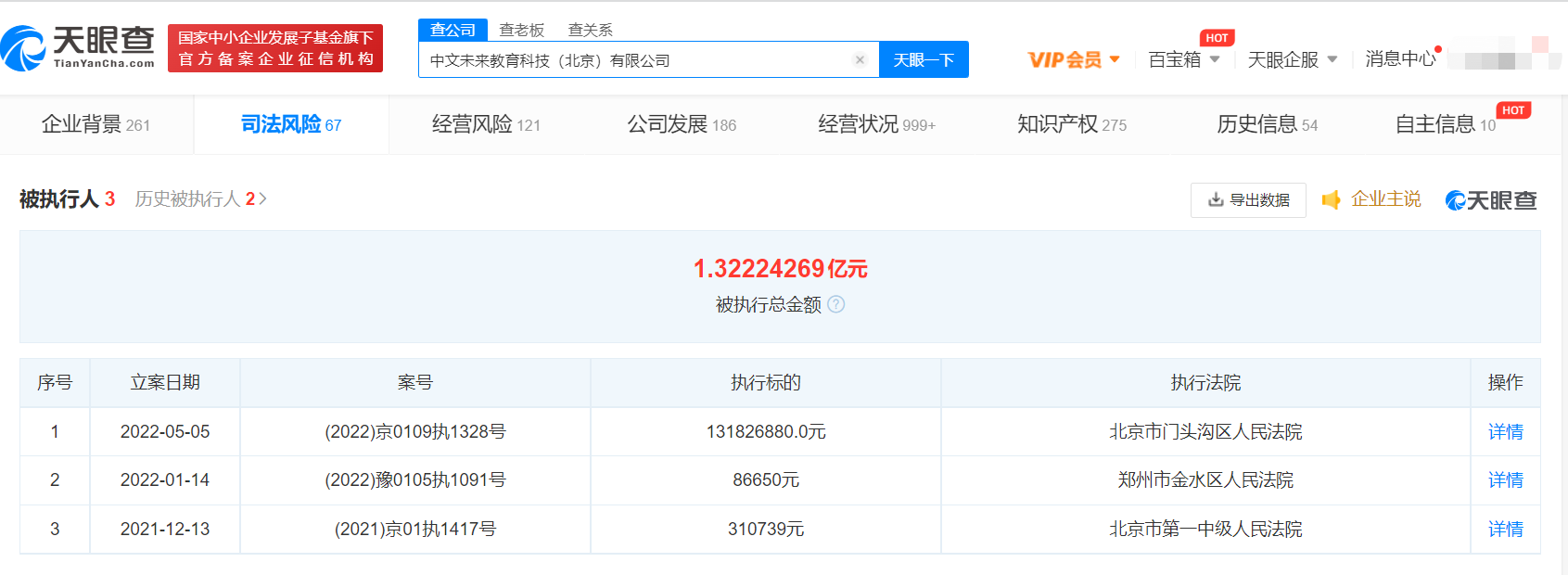 天眼查App显示,5月5日,豆神网校关联公司中文未来教育科技(北京)有限公司、北京立思辰新技术有限公司新增被执行人信息,执行标的1.3亿余元,执行法院为北京市门头沟区人民法院。