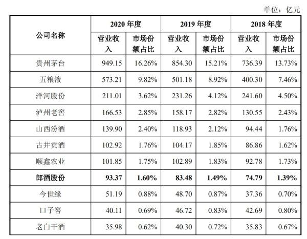 招股书显示,2018年到2020年,郎酒营业收入分别为74.79亿元、83.48亿元、93.37亿元;市场份额占比分别为1.39%、1.49%、1.60%。