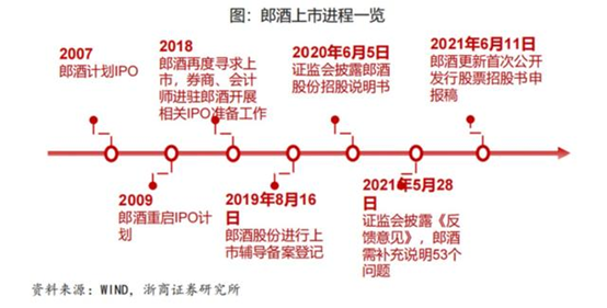 2020年5月28日,郎酒正式向中国证监会递交IPO招股书,但在2020年7月10日,其保荐机构广发证券因违规行为被证监会处于暂停保荐机构资格6个月、暂不受理债券承销业务有关12个月的监管措施。