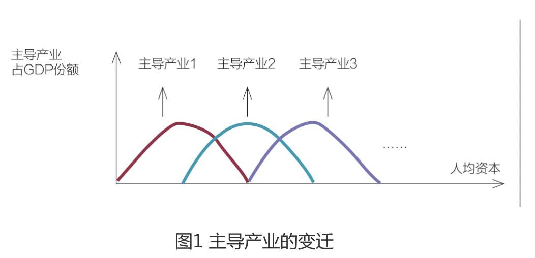 鞠建东、林毅夫、王勇(2015)在研究经济增长下的产业结构变化时发现:在经济增长的宏观表象下是产业结构的不断升级。如图1所示,在经济发展的过程中,每个主导产业都经历了诞生、扩张并达到顶点、收缩的生命周期。随着经济的发展,旧的主导产业开始收缩,新的主导产业取代旧的主导产业进入市场、扩张并成为经济增长的发动机。