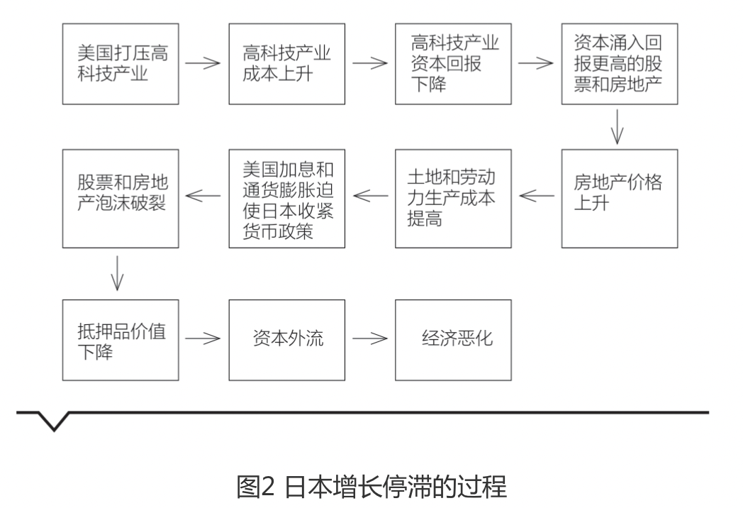 美国在半导体行业对日本政府、日本企业两手打压。从20世纪70年代开始,日本半导体产业,尤其是日立、三菱、富士通、东芝、日本电器五大公司,在日本通产省的产业政策支持下,在半导体产业与美国IBM、英特尔等公司展开激烈竞争。1985年,日本半导体产业在世界市场的份额超过美国,随后“美日半导体战争”爆发。日本半导体元件由1988年占全球市场份额的50.3%一路下跌到2019年的10%,损失惨重。同时,美日贸易争端使日本的发展停滞在电子、汽车、钢铁行业,错过了信息和生物工程产业发展的浪潮,使日本从享受高科技驱动带来的高回报、高增长的良性循环转入资本低利得、低增长、低收益的恶性循环,日本高科技产品的出口占制造业出口的份额从2000年的29%下降到2019年的17%。