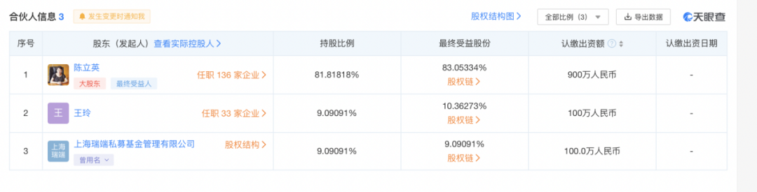 从股权结构来看,上海瑞端以自有资金出资人民币100万元,占瑞赫基金注册资本的9.09%。而该基金大股东为韵达联合创始人之一、韵达联席董事长陈立英,占股约81.82%。