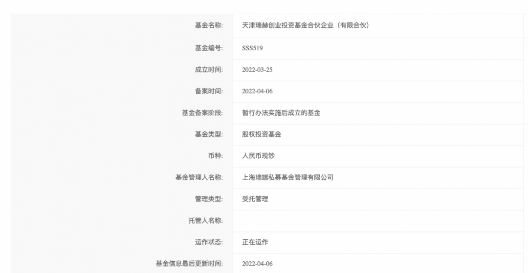 中基协备案信息显示,韵达旗下新基金天津瑞赫创业投资基金合伙企业(有限合伙)(下称瑞赫基金)已于今年4月6日完成备案登记,基金管理人为上海瑞端。