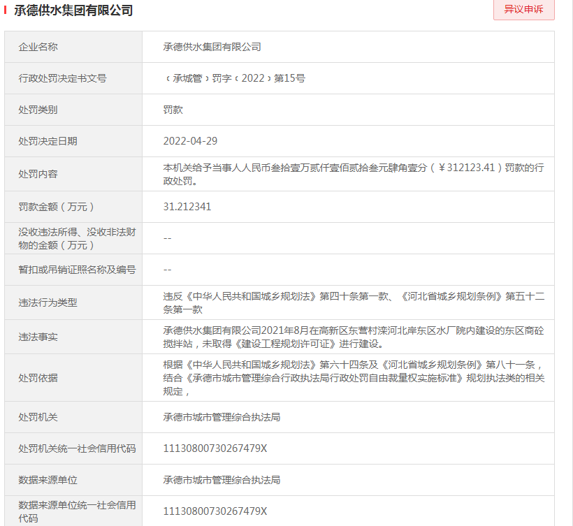 4月29日,承德市城市管理综合执法局作出一份行政处罚决定(﹝承城管﹞罚字﹝2022﹞第15号),剑指承德供水集团有限公司。