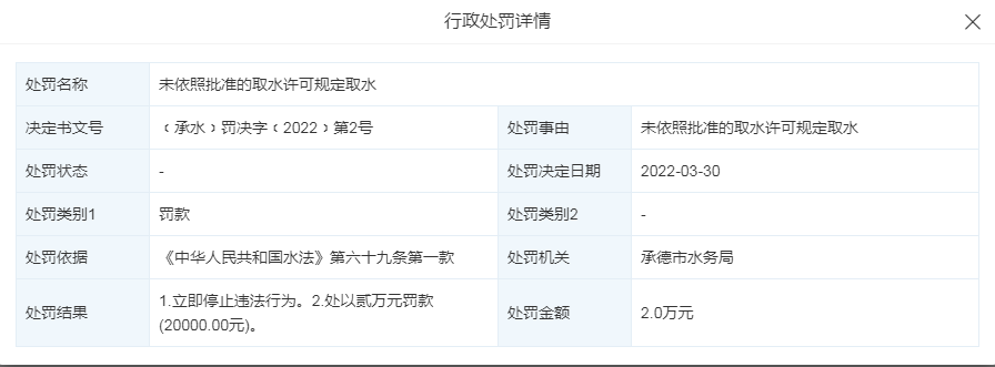 无独有偶,这是承德供水集团在2022年度收到的第二张罚单。3月30日,承德供水集团有限公司曾因存在未依照批准的取水许可规定取水的行为,被承德市水务局责令立即停止违法行为并行政处罚2万元。