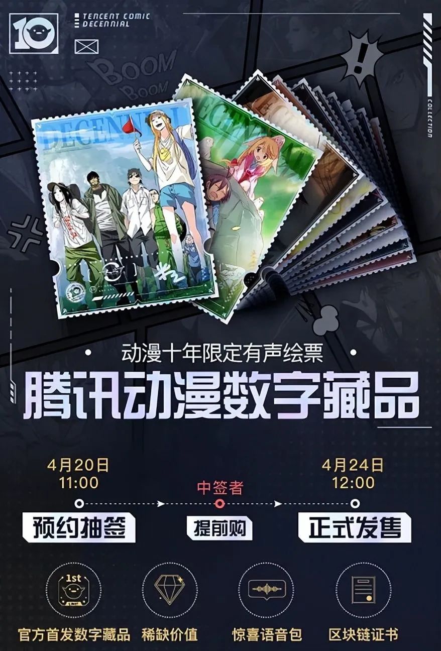 而像腾讯动漫App推出十周年纪念的数字藏品,不仅有相关动漫IP的插画,还配上了IP相关的定制音频。如此具有纪念意义的数字藏品,价格上涨100倍也并非天方夜谭。