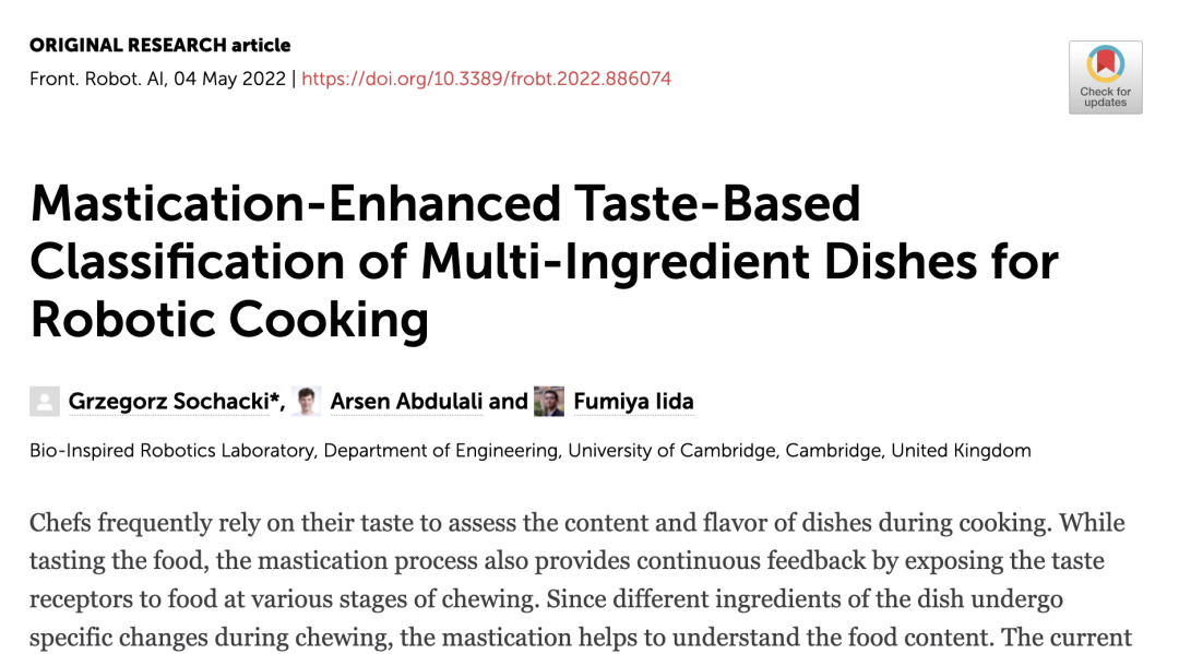 该论文标题为Mastication-Enhanced Taste-Based Classification of Multi-Ingredient Dishes for Robotic Cooking(《面向机器人烹饪的基于咀嚼增强味道的多成分菜肴分类》)已于5月4日发表在瑞士开放存取出版商Frontiers旗下的机器人学术期刊Frontiers in Robotics &AI(《机器人与人工智能前沿》)上。链接:https://doi.org/10.3389/frobt.2022.886074