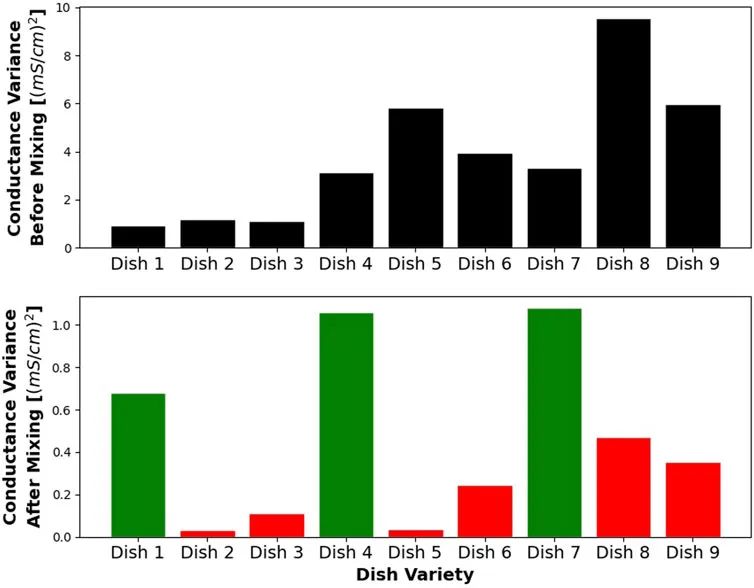 ▲不同混合阶段中不同添加剂菜品的电导测量直方图。