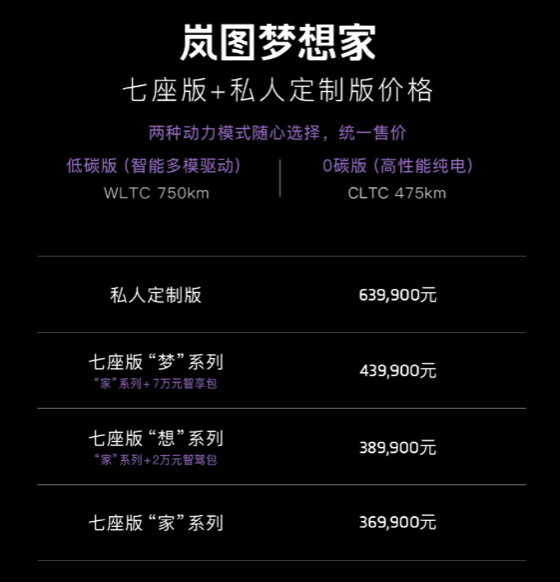 “VOYAH岚图”微信公众号消息,5月7日,定位于电动豪华旗舰MPV的岚图梦想家正式上市。该款新车共推出3个系列车型(7座版)以及私人定制版车型。前者售价区间为36.99万-43.99万元,私人定制版售价63.99万元。