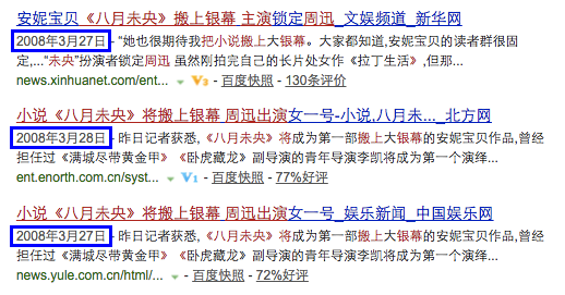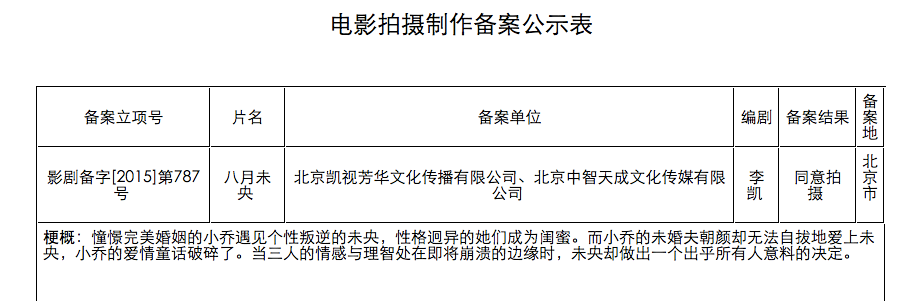 实际上,在剧版《八月未央》宣布启动的8年前,也就是2008年,该小说就曾被媒体报道要被拍成电影。当时的报道称,青年导演李凯透露因与作家安妮宝贝有过一段时间的交往,后自掏腰包,以友情价拿下《八月未央》的电影改编权,并历时两年完成剧本改编。他还对媒体表示过心目中最合适的演员是周迅。电影预算800万左右,计划于2008年9月在上海开机。