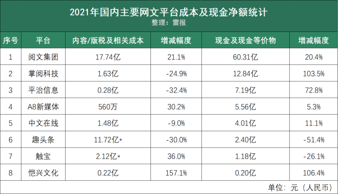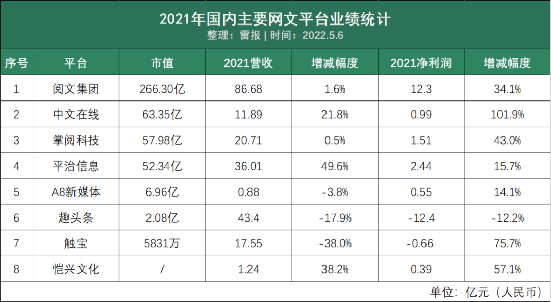 恰逢近日国内主要上市网文平台都已公布完毕2021年财务报告,雷报据此将分析网文行业最具代表性的几家公司的年报,以对该行业做更深入透彻的了解。本文分析公司共计8家,包括A股上市的掌阅科技、中文在线、平治信息,港股上市的阅文集团、A8新媒体、美股上市的触宝和趣头条以及近期再次向港交所提交上市申请的恺兴文化。