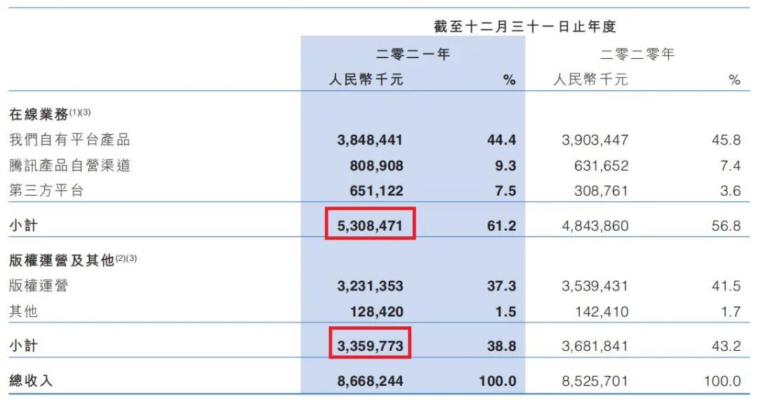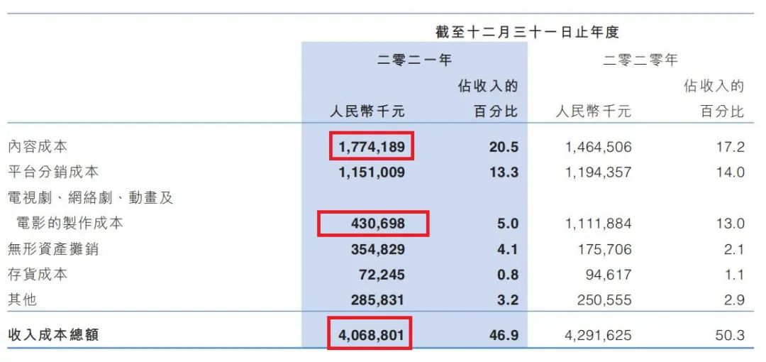阅文集团17.74亿元则仅为其内容成本数额,根据财报显示,2021年阅文集团总收入成本实际超过40亿元,除了内容成本外,2021年阅文的平台分销成本为11.51亿元,无形资产摊销成本为3.55亿元,电视剧、网剧、动画及电影的制作成本也高达4.3亿元。